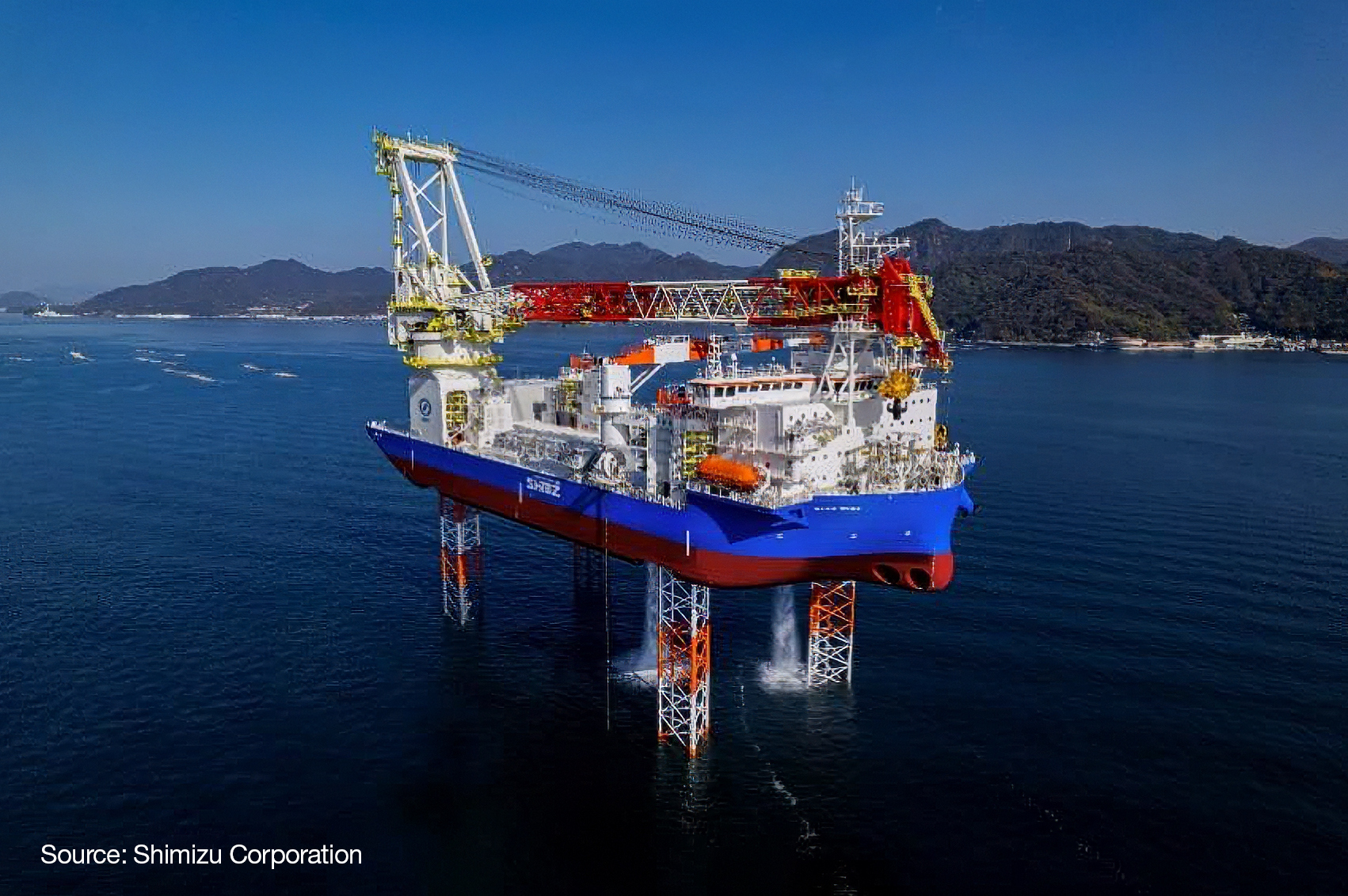Shimizu’s SEP vessel BLUE WIND, which began operations in 2023, was built to strengthen the company’s competitiveness in the renewable energy sector and further expand its engineering business. It also represents one of the company’s initiatives toward realizing a decarbonized society under its environmental vision, SHIMZ Beyond Zero 2050. At 142m long and 50m wide, it is one of the world’s largest wind turbine installation vessels. It can transport all the components for seven 8MW turbines or three 12MW turbines at one time, helping to significantly reduce the duration of construction projects.
