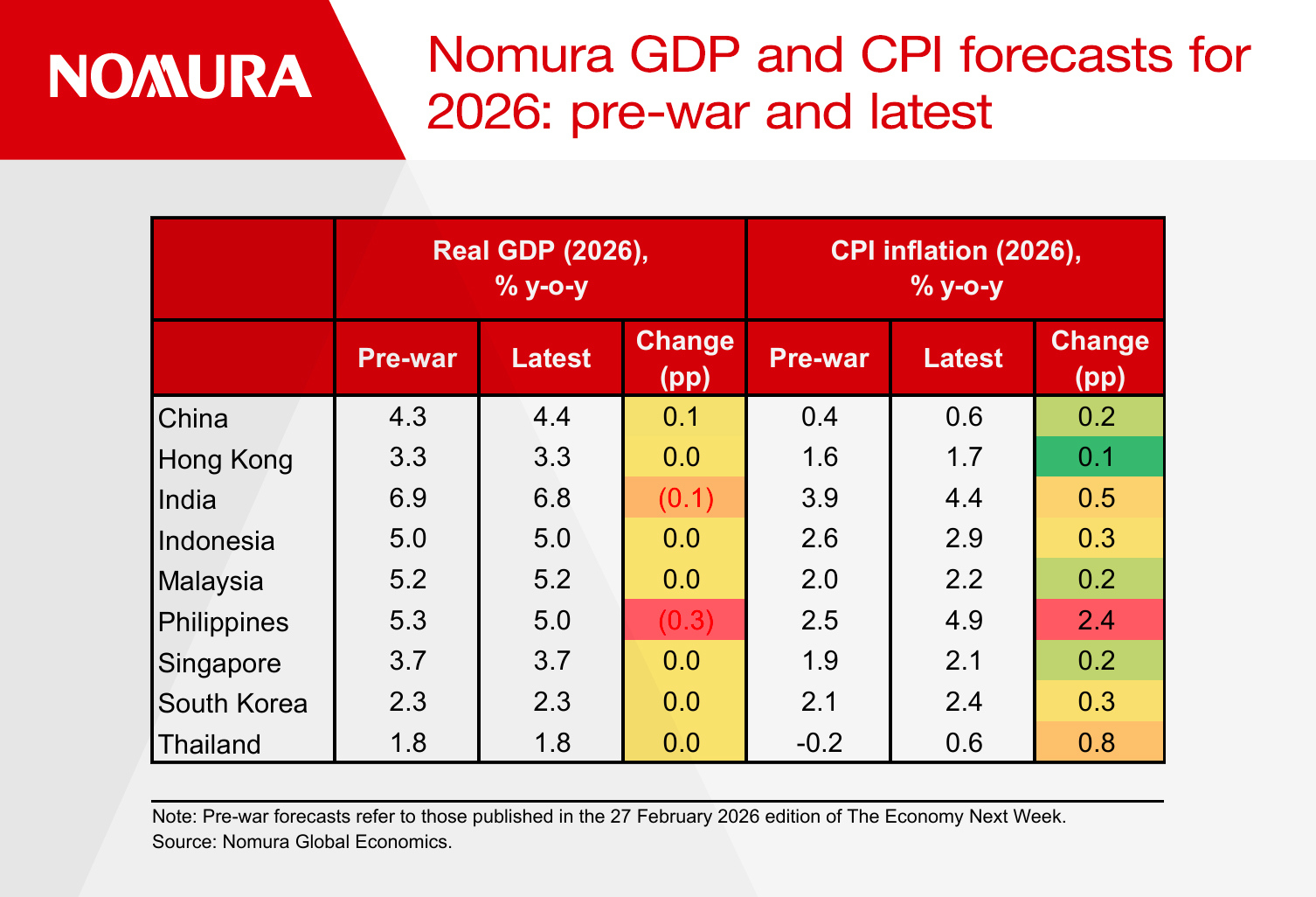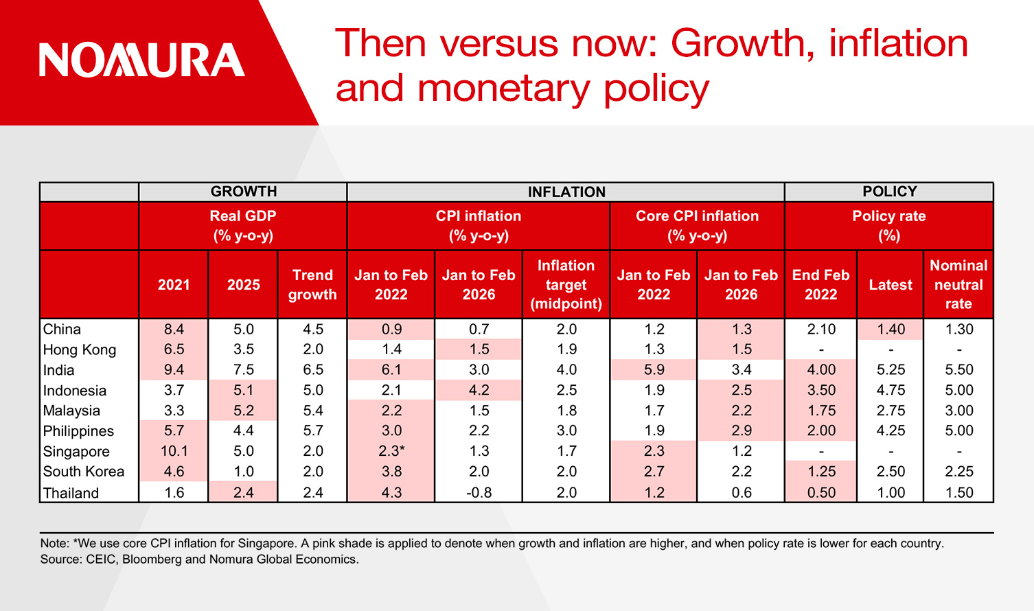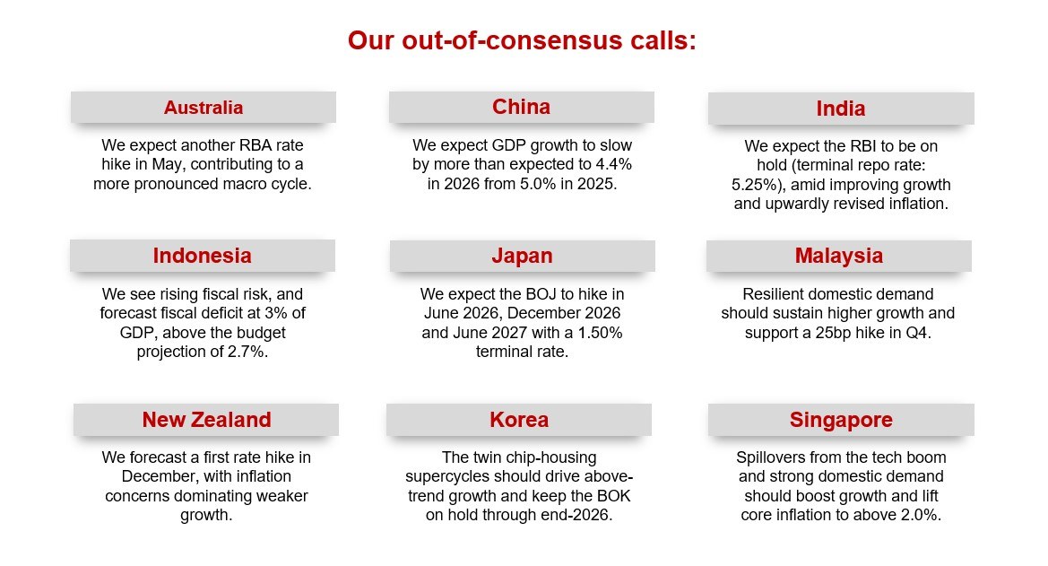 Two exceptions stand out: the Philippines and Singapore. Philippine core inflation is expected to surge, driven by energy pass-through effects on restaurants, recreation, personal care and other energy-sensitive categories. In Singapore, core inflation should also rise as the energy price increase flows through to utilities, while higher fertilizer and shipping costs raise food prices, amplified by second-round effects from the positive output gap.