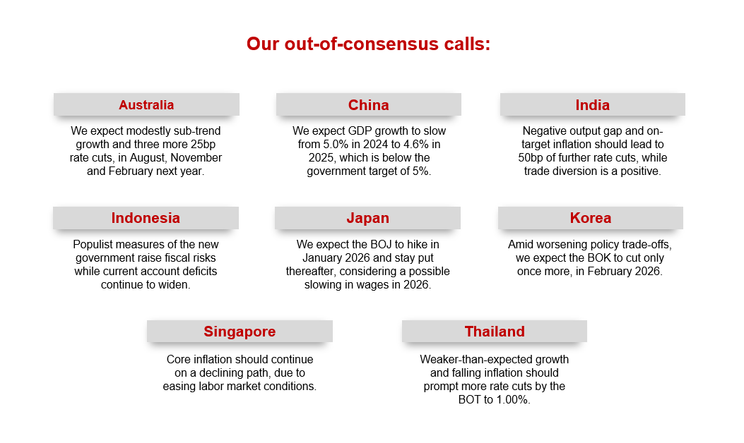 On monetary policy, Asian central banks recently surprised markets by shifting gears from accommodative to neutral, with the Bank of Thailand looking to preserve policy space, the Bank of Korea focusing on financial stability risks, and the Reserve Bank of India changing its stance to neutral. However, with a likely growth downshift and US tariffs back to Liberation Day levels, the second leg of Asia’s easing cycle could begin soon.
