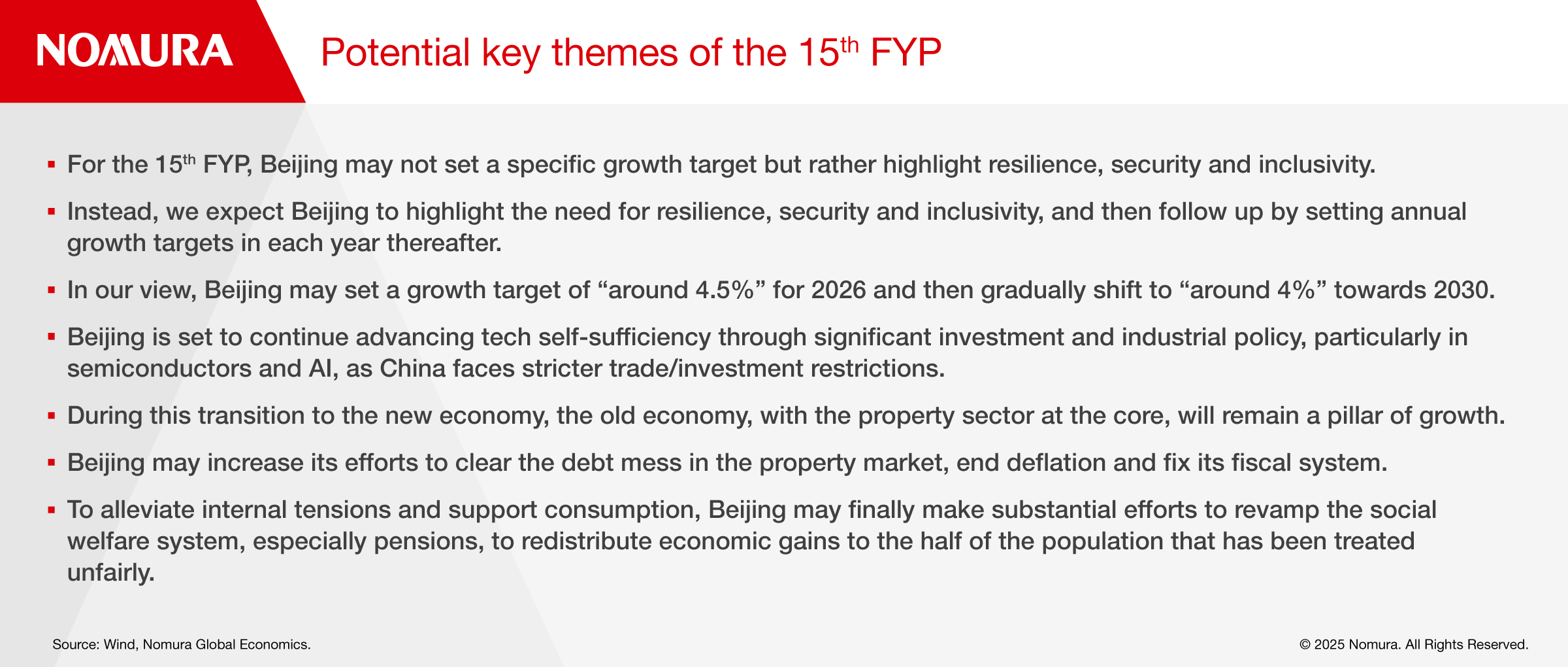 In our view, the 15th Five-Year Plan will need to address the more difficult policy issues, such as how to manage the cleanup of the property sector, maintain competitiveness in an increasingly challenging global trade environment, and boost consumption.