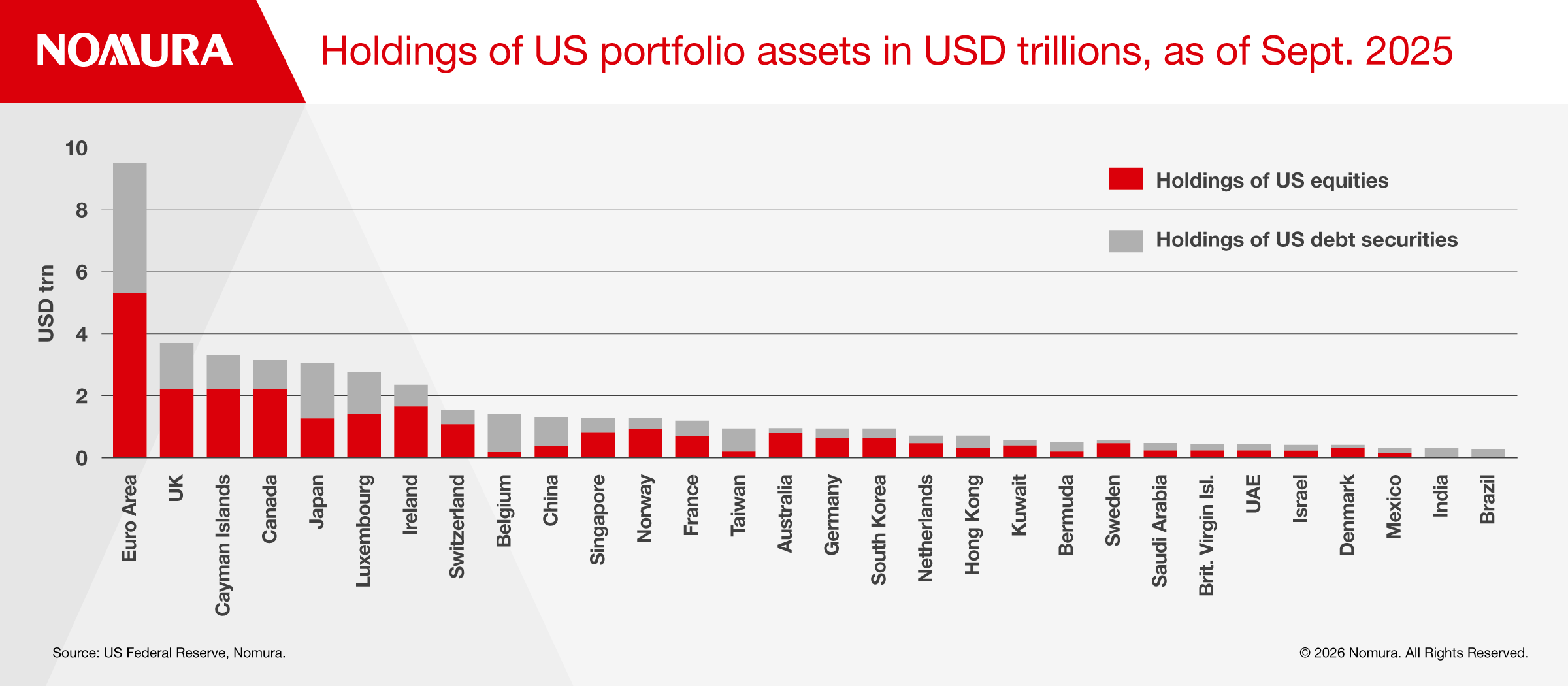 The heavier version of de-dollarization refers to a more structural decline in the broad USD index, including an erosion of the status of USD as the premier global reserve currency. Under the heavier version, foreign investors could start to de-risk from USD assets by selling existing USD holdings. De-risking could be sparked by a massive AI crash or the erosion of trust in US policies and institutions — including the rule of law and Fed independence — reaching a tipping point. However, the notion that there is currently no alternative to the depth and liquidity of US capital markets is a powerful counterargument to a sudden shift to the heavier version.