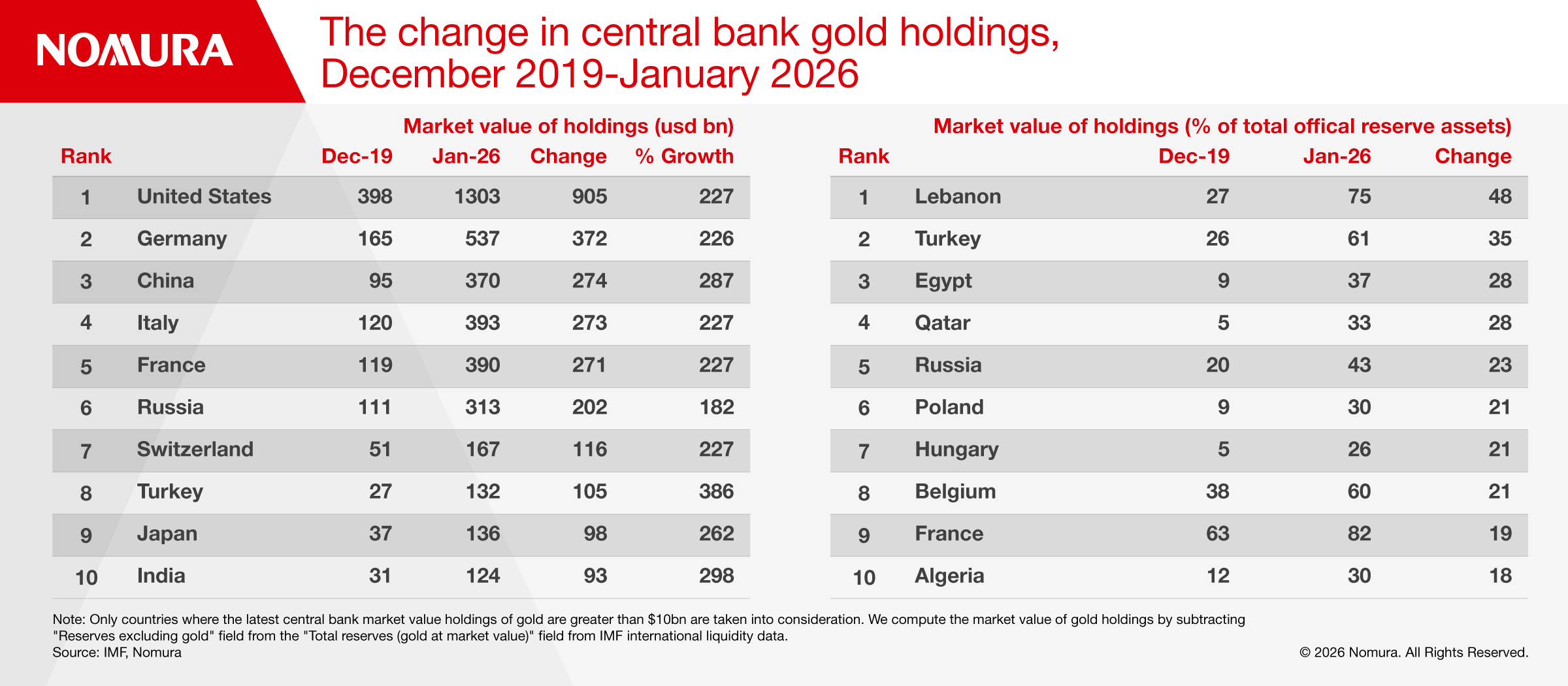 Based on IMF data, central banks’ total holdings of gold at market value was $5.1 trillion in January 2026, having surpassed total foreign official holdings of US Treasury securities in September 2025. Based on the current trajectory, central banks’ total holdings of gold could overtake total foreign non-official (private) holdings of US Treasury securities later this year.