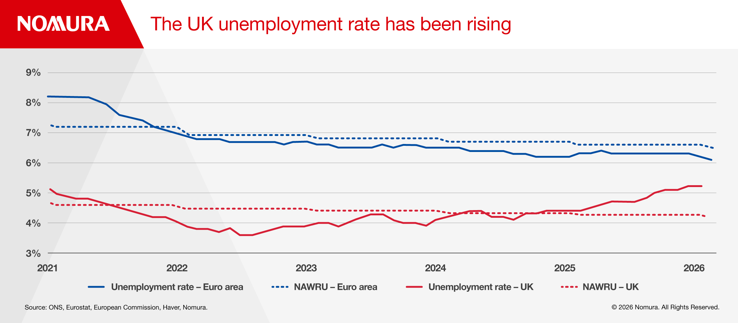 In the euro area, the unemployment rate was 6.2% in February 2026 (Figure 2), the lowest recorded in the bloc since the introduction of the euro. In the UK, meanwhile, the unemployment rate was 5.2% in January 2026, up 1.6 percentage points since a recent low of 3.6% in July 2022. This would suggest that the euro area labor market is tight now, as it was in 2022, whereas the UK labor market is exhibiting meaningful slack, unlike in 2022.