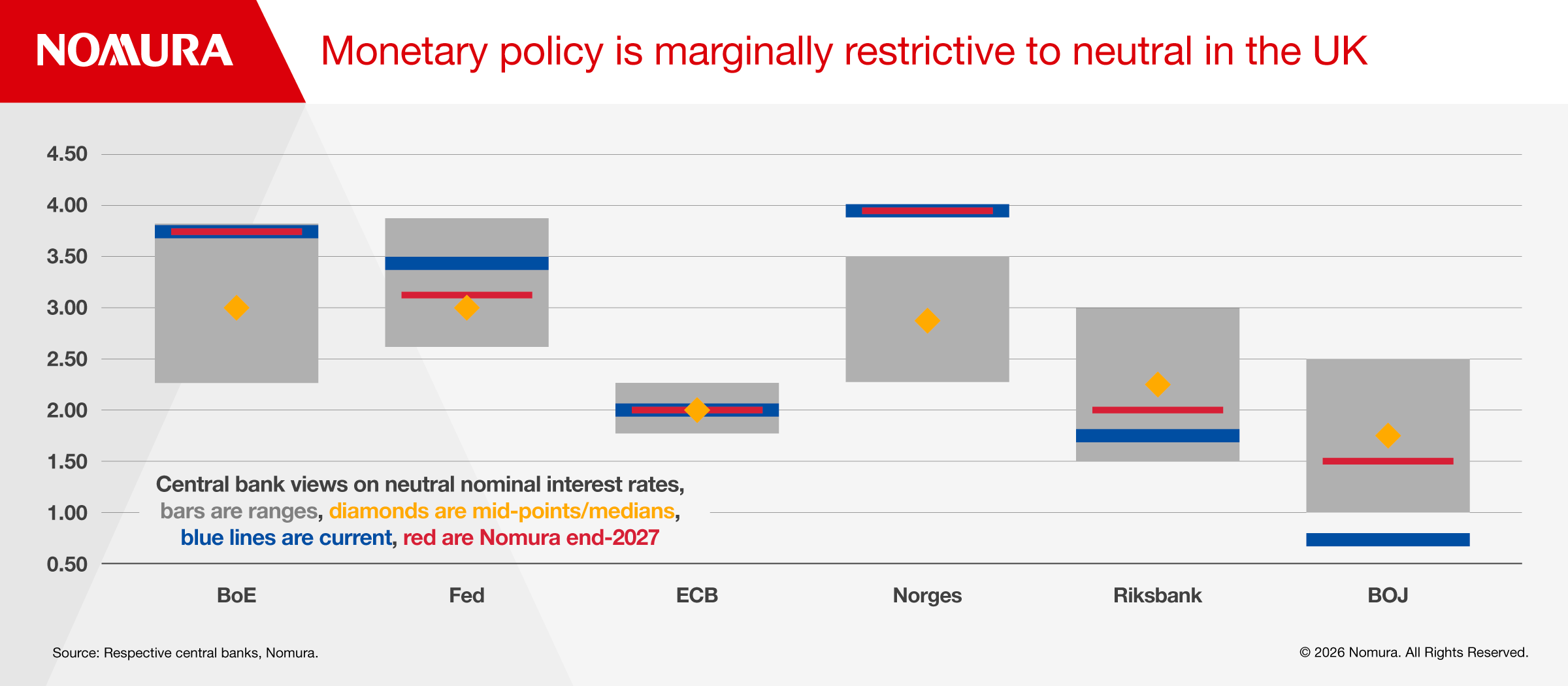 However, in our baseline, both the ECB and BoE are likely to leave rates unchanged through the fourth quarter of 2027. This assumes that events will unfold in such a way that the energy shock from the war in Iran will have a limited impact over the medium term.