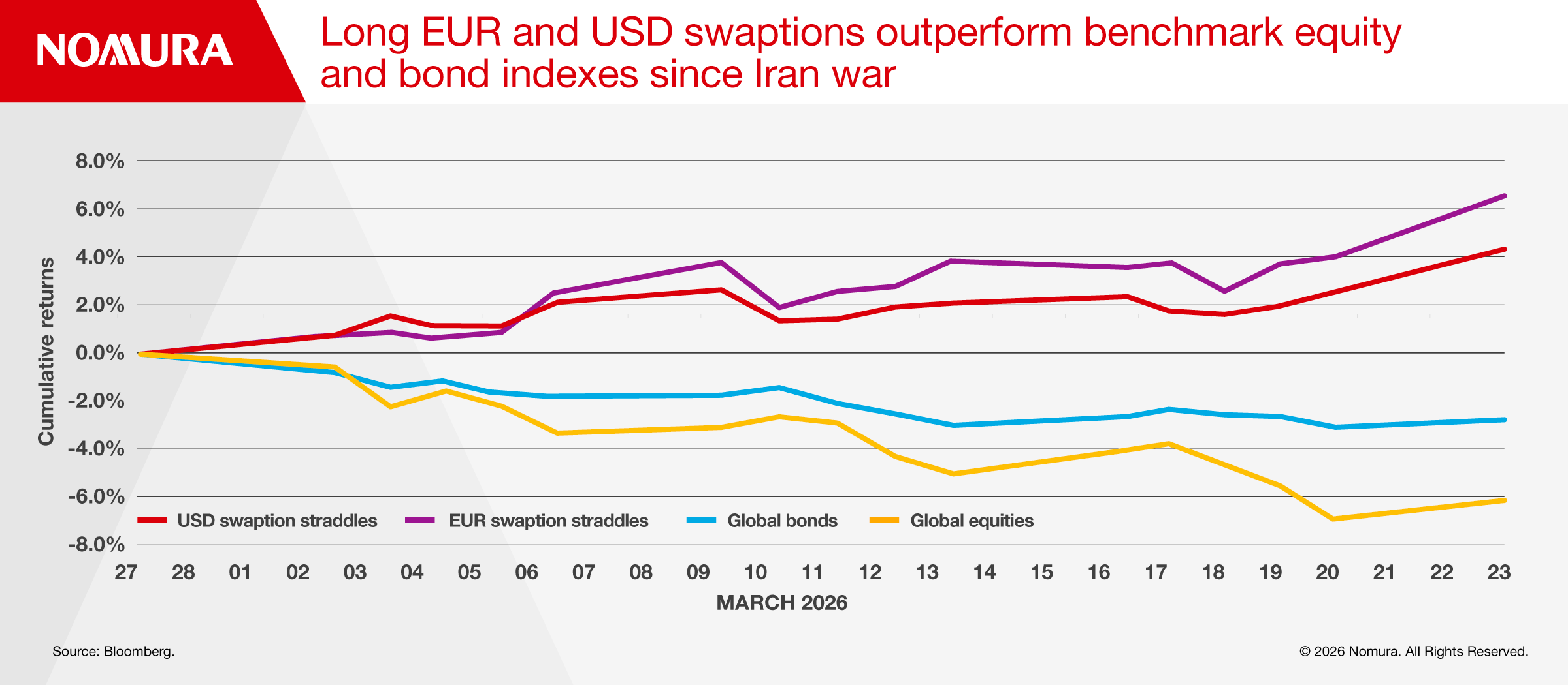 Iran war undermines the long-held assumption that bonds and equities offset one another in times of crisis but supports the case for long swaption straddles as a hedge
