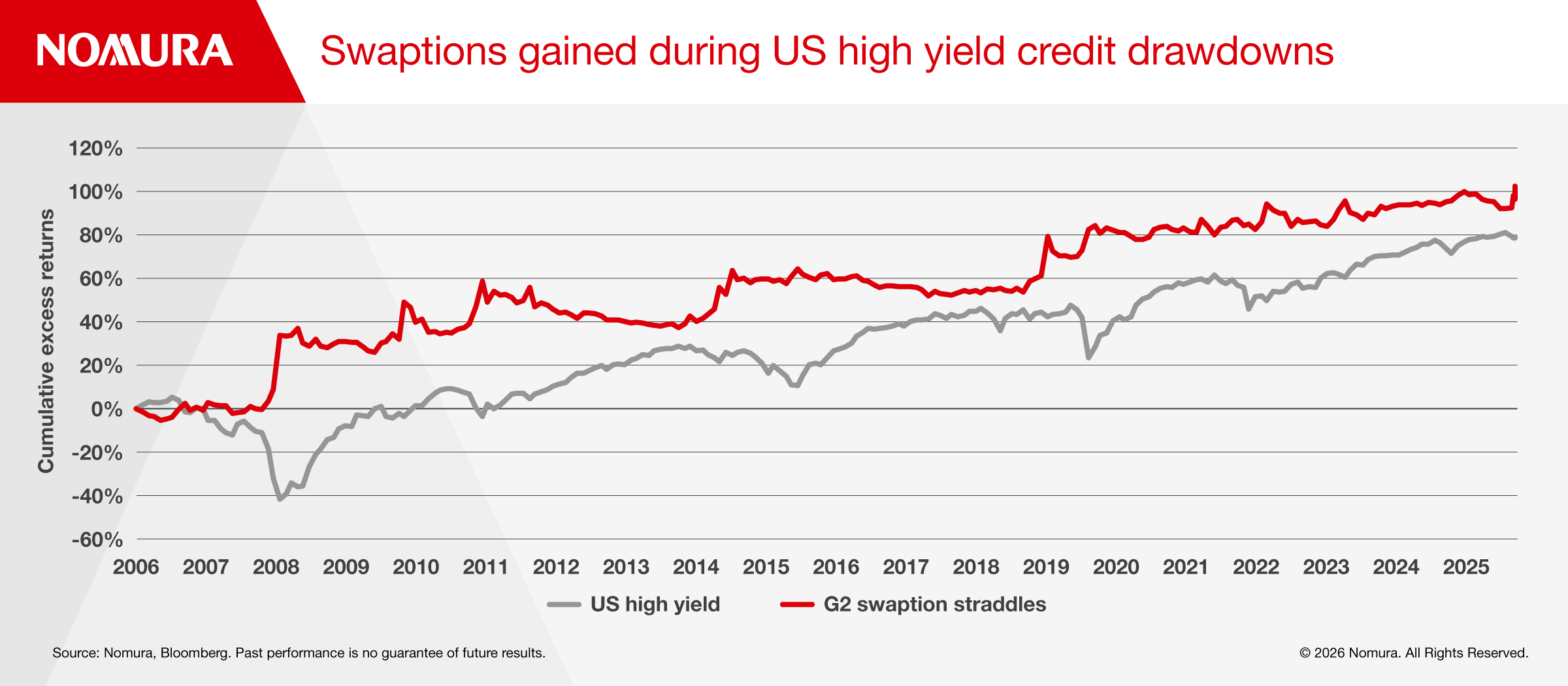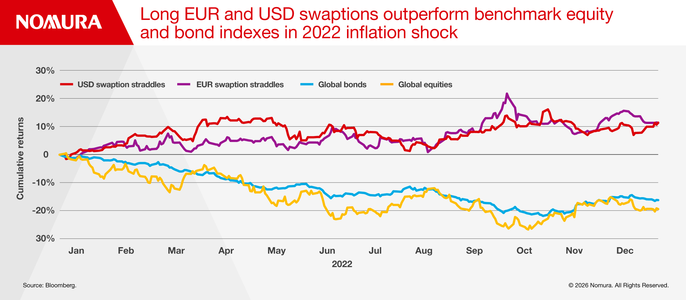 “Not only did long swaption straddles work in these two inflationary shocks, but they also delivered returns during the classic deflationary shocks, when equities and credit suffered drawdowns, but government bonds did well,” says Morris.