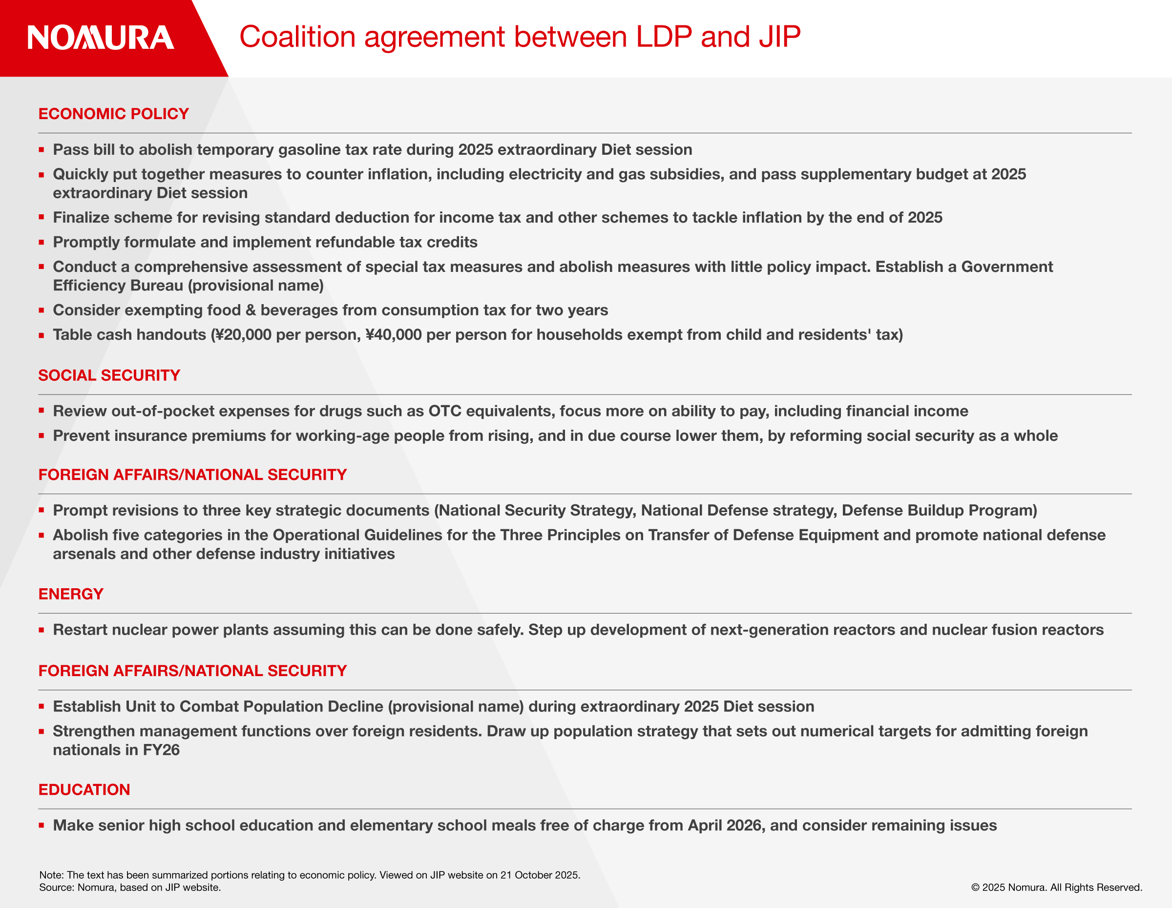Judging by the ruling coalition agreement between Takaichi’s Liberal Democratic Party (LDP) and the JIP (see table below), it looks as though neither fiscal nor monetary policy will be as expansionary as the markets had been concerned about initially, and they will be disciplined to some extent.