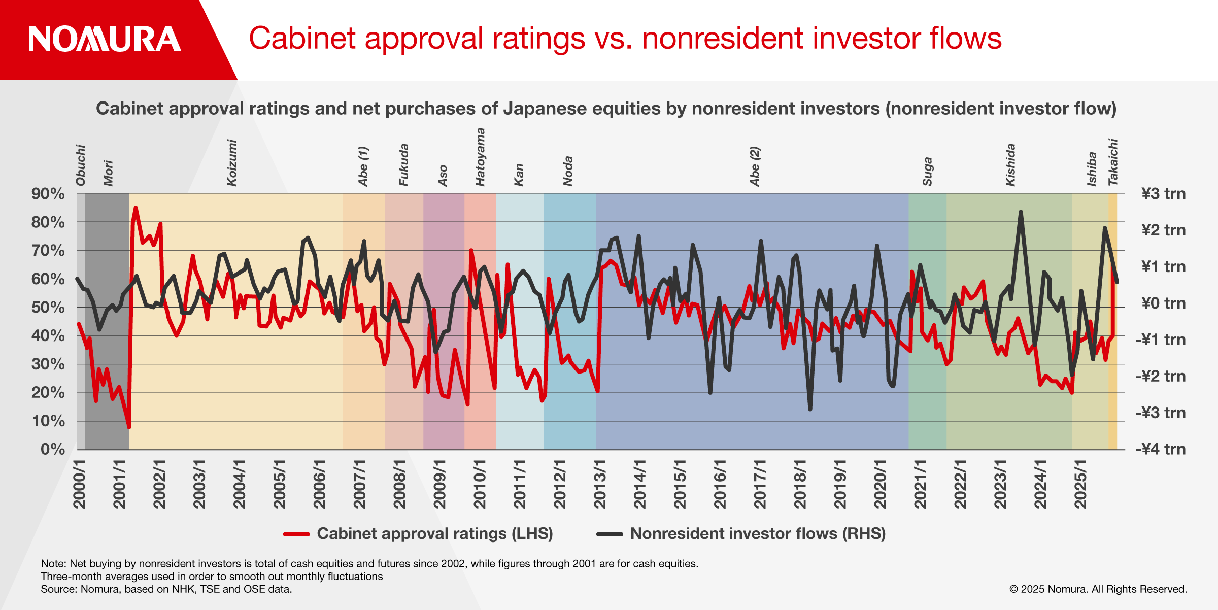 We will be watching whether the Takaichi Cabinet can keep its approval ratings high, as we see this as the key to the achievability of Sanaenomics. High Cabinet approval ratings have tended to spur net buying of Japanese equities by nonresident investors (Figure 1) though the correlation has fallen slightly in recent years. The TOPIX also tends to perform solidly when Cabinet approval ratings are high.