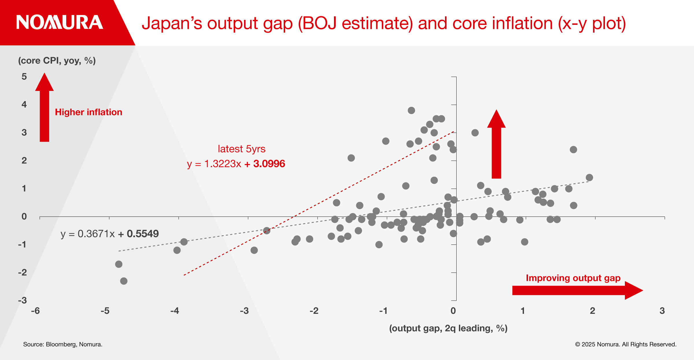 Japan may be more prone to inflation now, he acknowledged. Over the past five years, the slope in the relationship between the output gap and inflation has steepened. The exchange rate pass-through from FX to CPI has also risen, notably in services, which reflects inbound tourism. And prices are sticky on the downside. Companies raise prices when the yen weakens but do not lower them much when it strengthens, signaling changed pricing behavior.