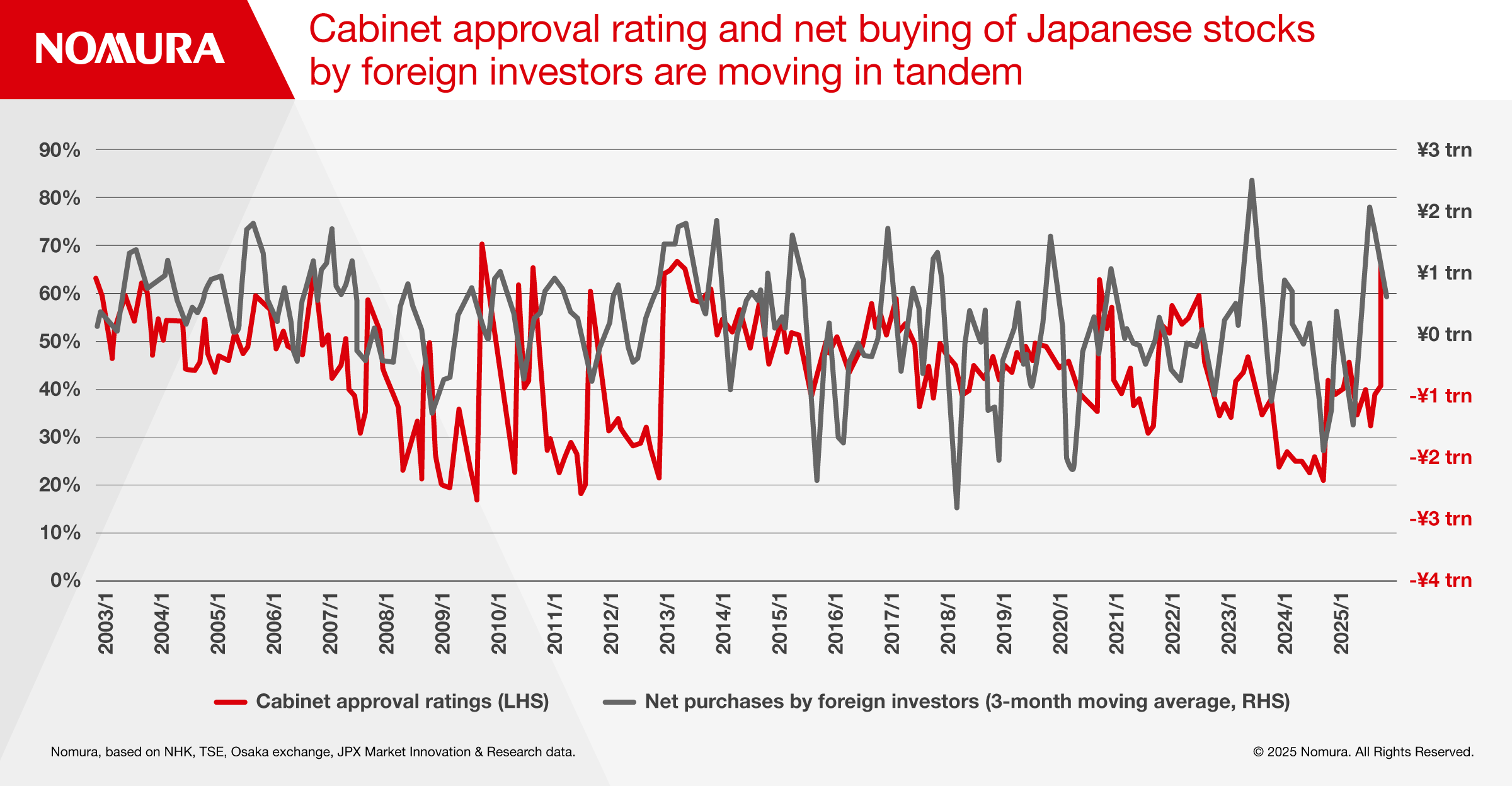 Kitaoka observes that overseas investors are more likely to invest in Japanese equities when the Cabinet has a high approval rating. They respond favorably to an environment where policymakers aim for high nominal growth while keeping rates contained and channeling capital to strategic sectors. Priority policy themes of this administration include defense and nuclear power, as well as new energy, such as fusion energy and perovskite solar cells.