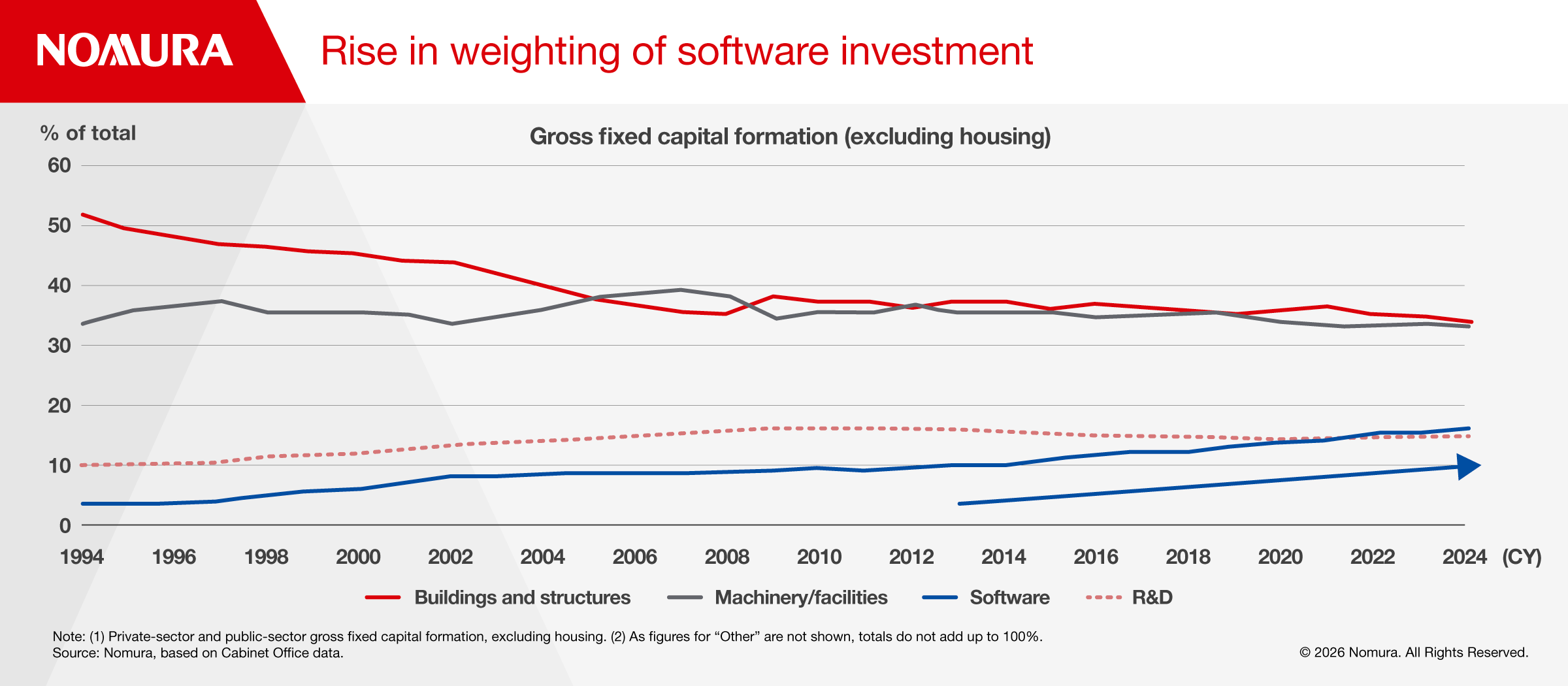 Software accounted for 16% of private-sector and public-sector gross fixed capital formation (excluding housing) in 2024, surpassing R&D (Figure 2). Also, according to METI and BOJ data, there has been a clear upward trend in the sale of custom software since 2021.